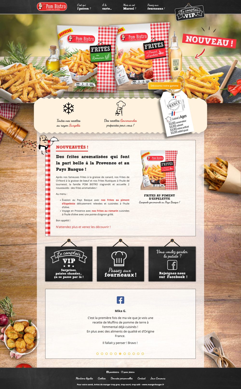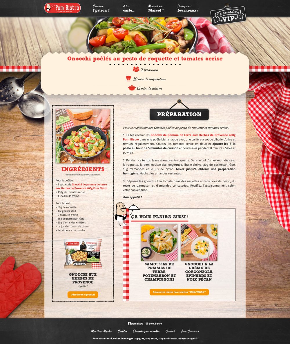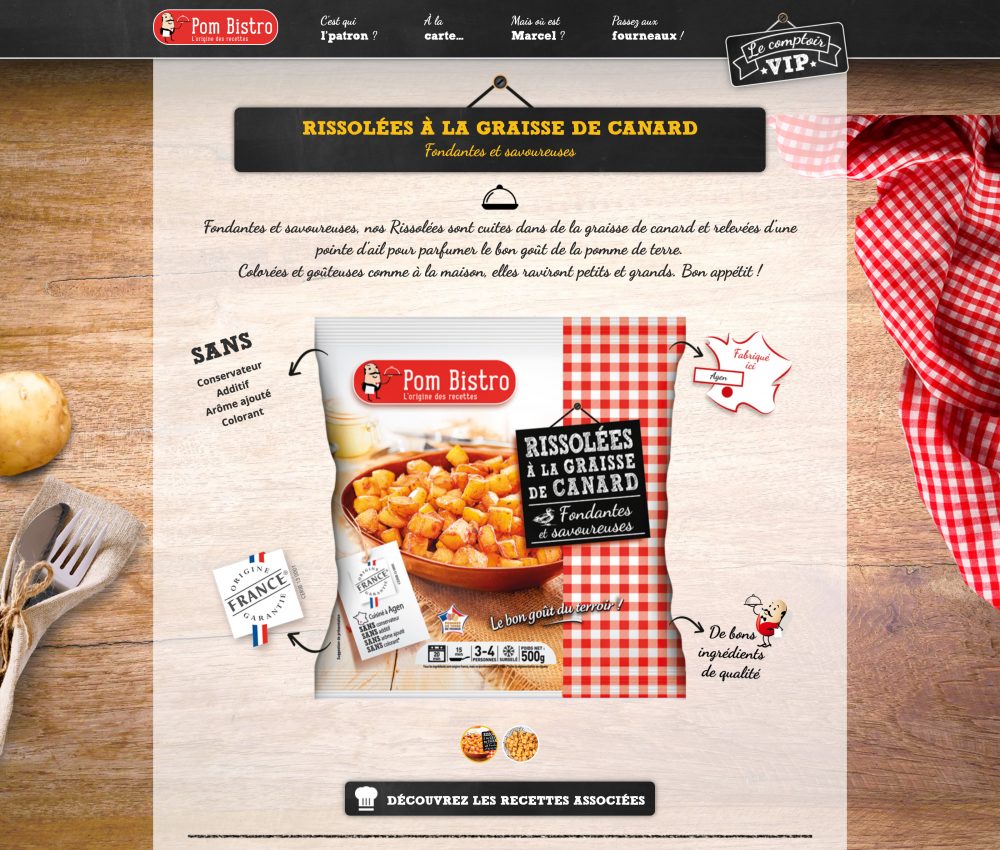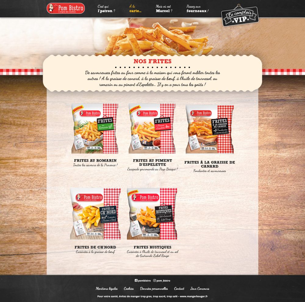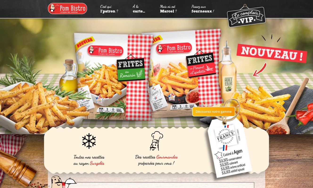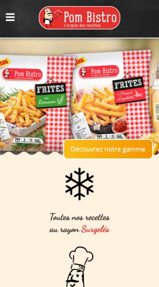 Pom Bistro est une marque de produits surgelés à base de pomme de terre, présente en supermarchés. En 2017, j’ai collaboré avec l’agence Nutrikéo sur le développement de leur site web. Les fiches produits, les magasins et les recettes sont présentés dans un design sur mesure à l’esprit bistro et gourmand.